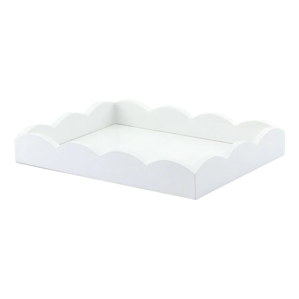 Designed to sit beautifully on any bedside table, coffee table, or sideboard this glossy, white lacquer tray boasts a playful scalloped edge and deep straight sides. A must-have for any home this piece functions wonderfully as a vanity tray, drinks tray, or for displaying small trinkets.