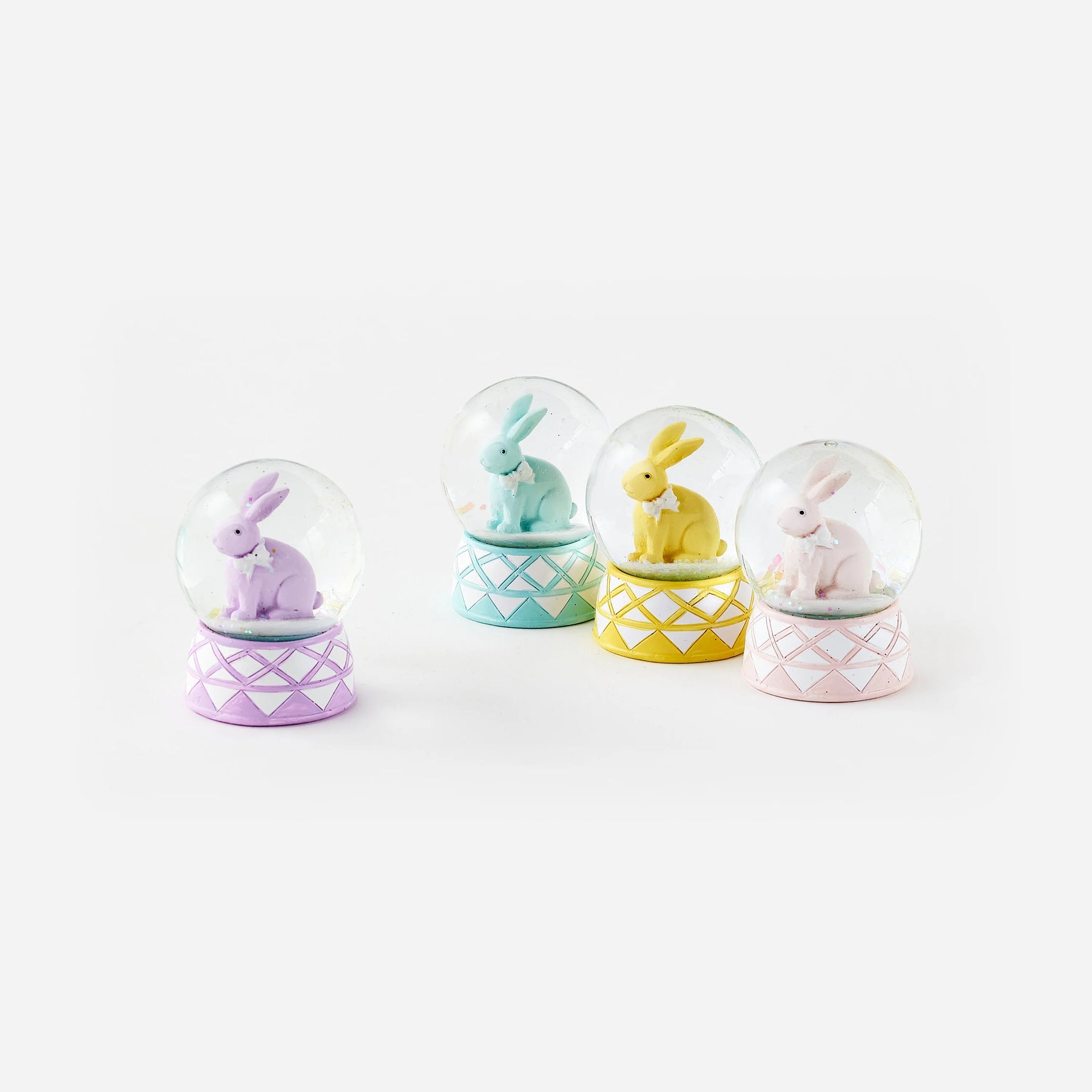Add a whimsical spring accent with these pastel bunny water globes. Each globe features a darling bunny surrounded by floating details, set on a colorful, patterned base for a playful finish.