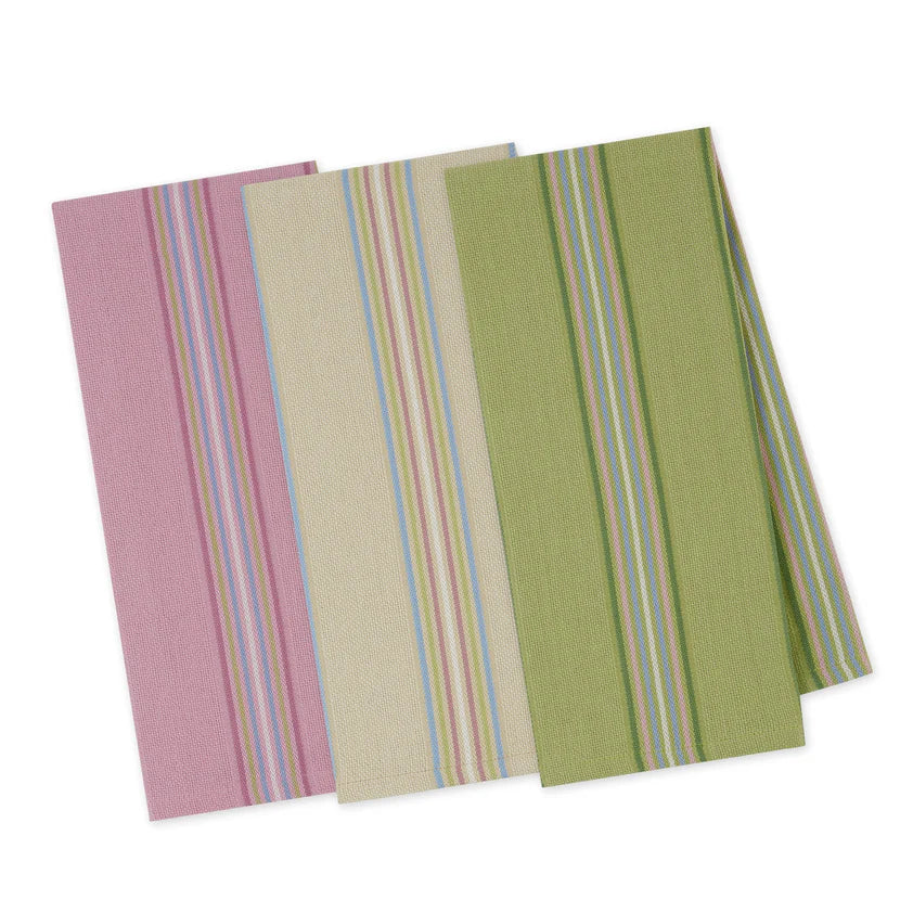 This set of three heavyweight dishtowels features soft pastel stripes in coordinating spring colors. Durable and absorbent, they’re designed for everyday kitchen tasks while adding a fresh, seasonal touch.