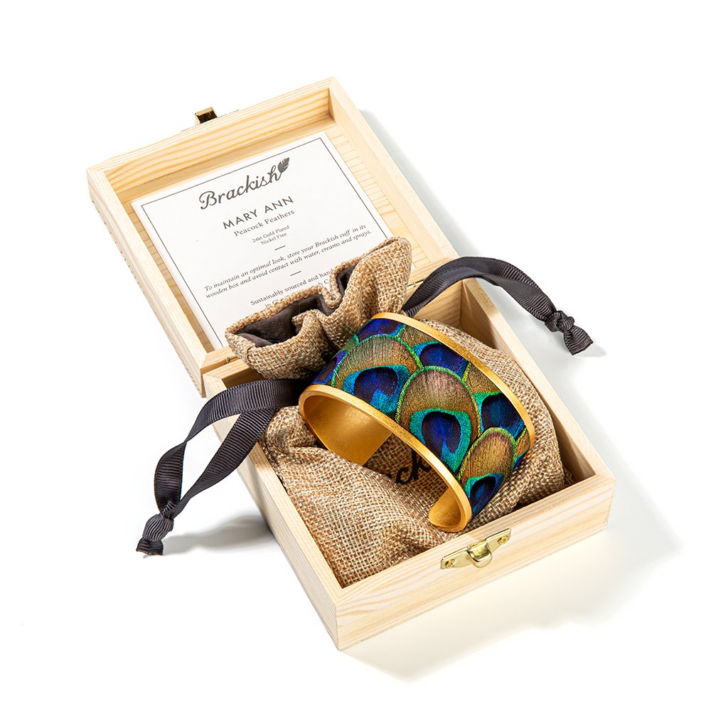 - Arrives in a hand-branded, pine gift box with a jewelry bag. Includes a list of feathers used and instructions on how to care for your cuff.