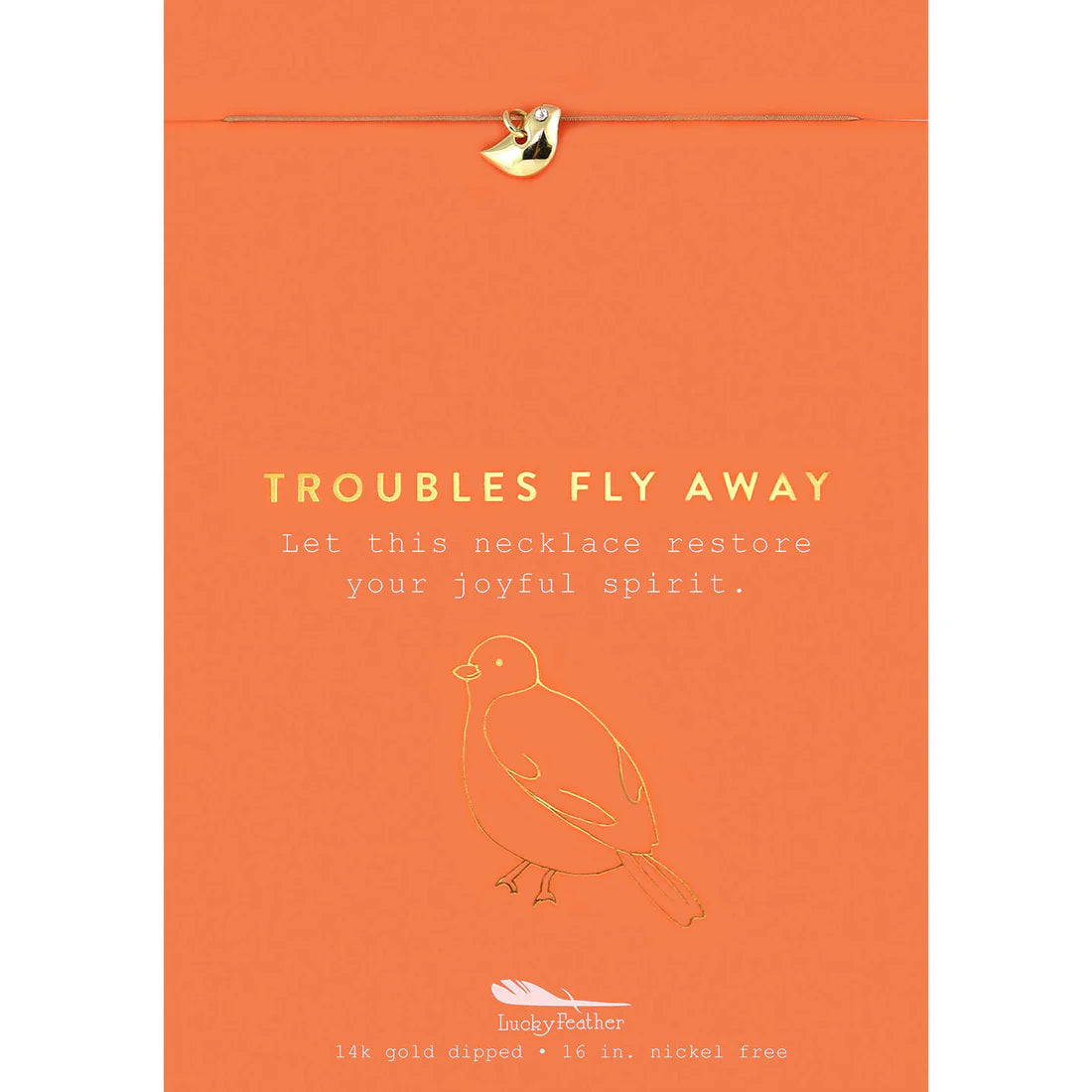 TROUBLES FLY AWAY with a delicate and dainty necklace. The gold Bird necklace will take away your fears and troubles. Let this necklace restore your joyful spirit. Perfectly sized 16" cord to accommodate most neck sizes.