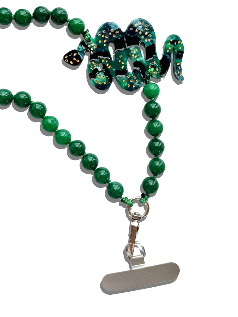 Crafted by specialty artisans, these phone chains are handmade featuring natural gemstone beads and an iconic hand-painted charm.