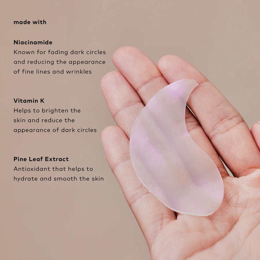 Hydrogel under eye patches to reduce the appearance of dark circles. Infused with Niacinamide, Vitamin K, and Pine Leaf Extract. Perfect for after late nights and earlier-than-usual mornings.