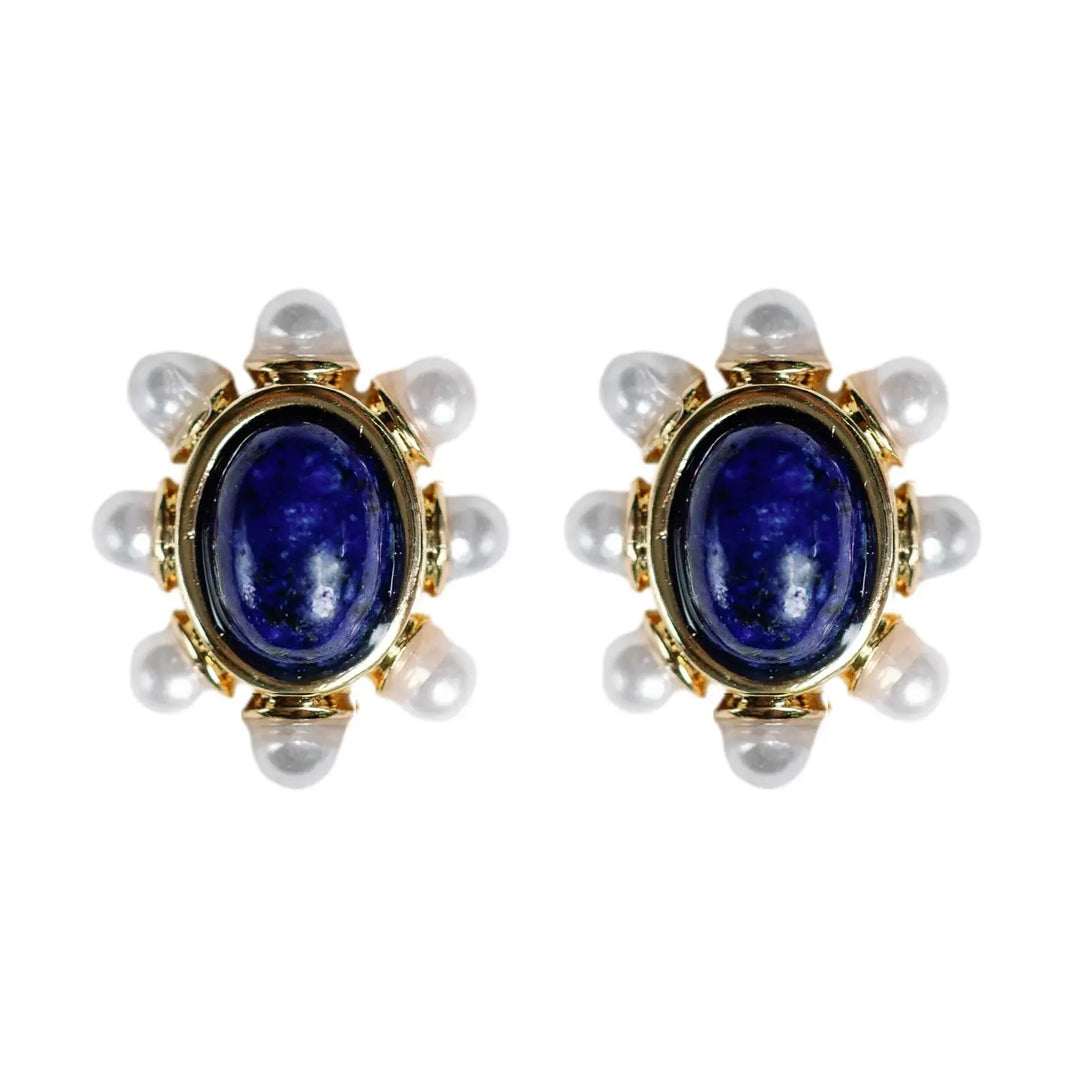 Blue Lapis and Pearl Oval Stud Earrings