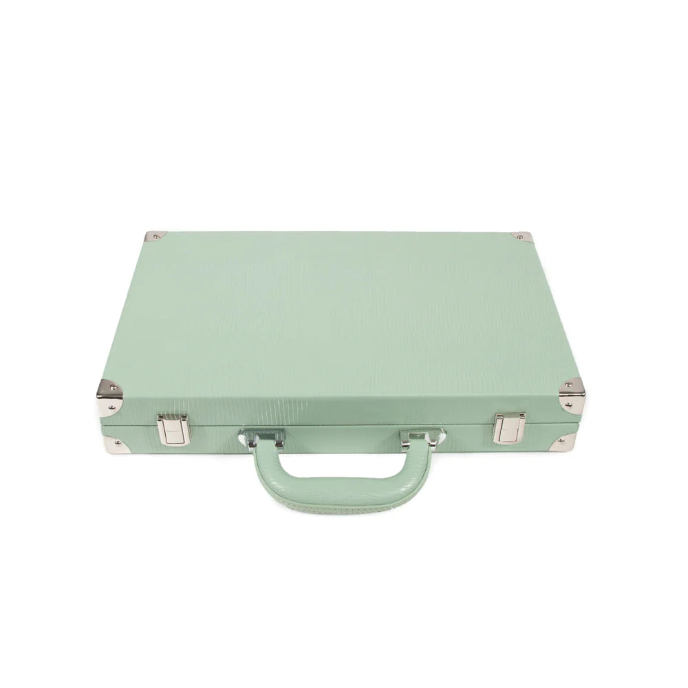 The Bradley Backgammon Set is presented in the best lizard vegan leather case with carrying handle and accented with metal corners. Features felt interior with painted triangles, dice cup, black and ivory chips and dice. Perfect for game nights with family and friends.