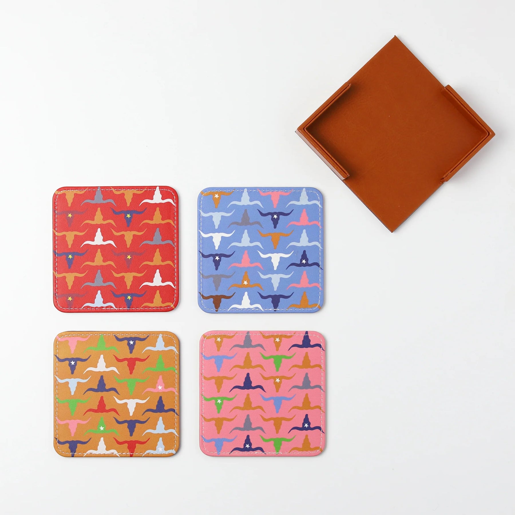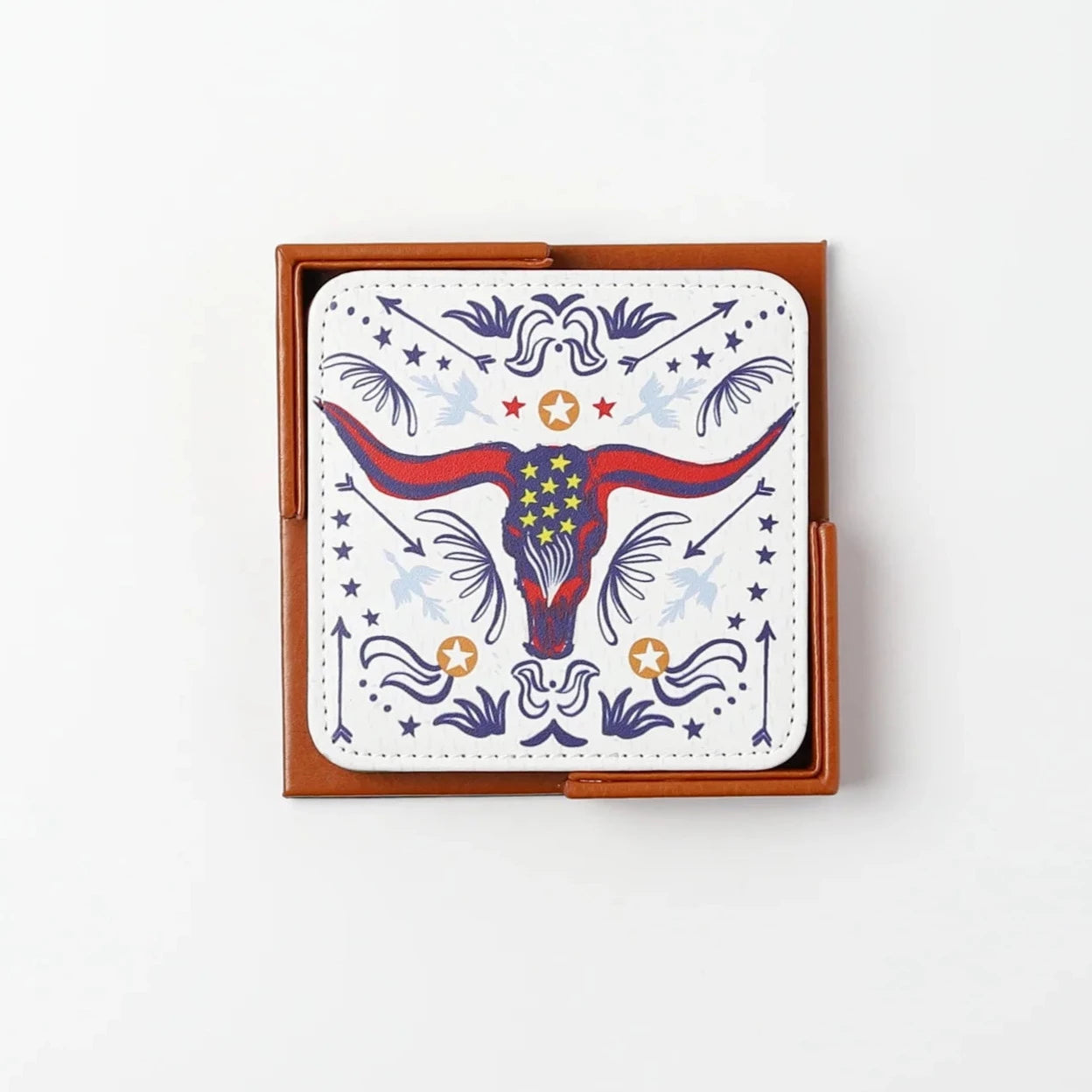 Bring a touch of the outdoors to your tabletop with this set of 4 reversible coasters featuring artistic longhorn prints. A thoughtful housewarming, hostess, or gift for someone special (or yourself!)