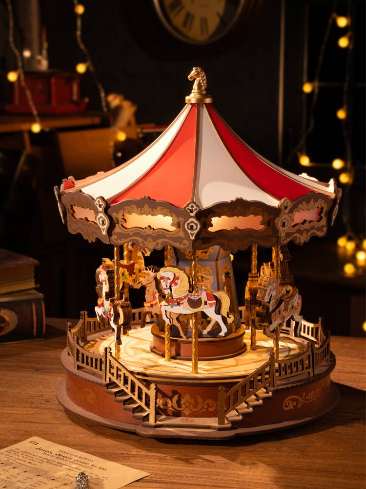 Bring the whimsy of a classic carousel into your home with this charming 3D wooden puzzle from Robotime. Designed for adults, this delightful music box features a rotating top and galloping horses that move in sync with the music. A perfect combination of creativity and nostalgia, it makes a thoughtful gift or eye-catching decor piece.
