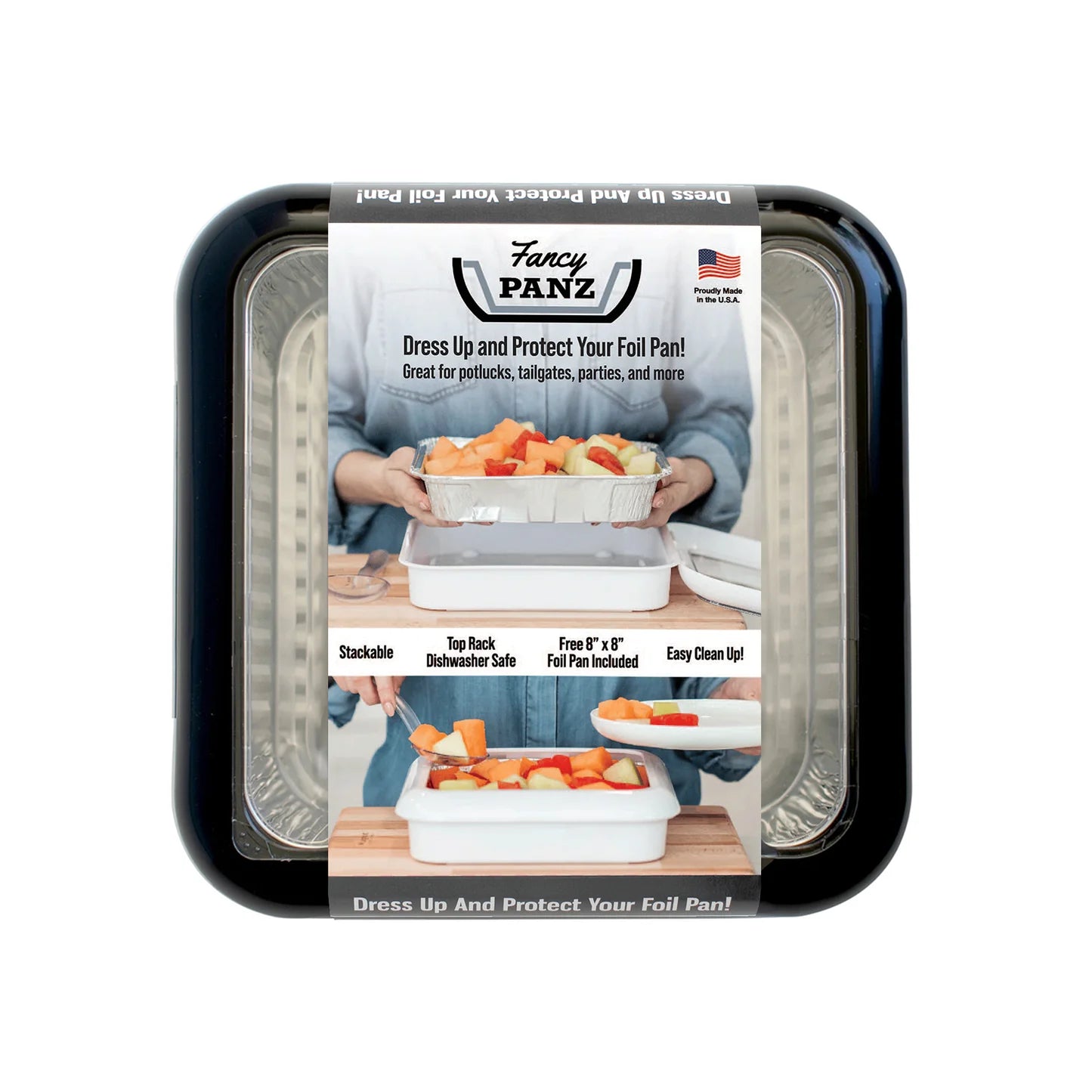 Fancy Panz 8x8 brings elegance and convenience to your favorite 8x8 foil pans, commonly known as a brownie pan. Simply place the pan in your Fancy Panz, remove the clear window, and you’re ready to serve. When the event wraps up, just lift out the foil pan, leaving your Fancy Panz clean and ready for the next use. No messy dishes to scrub and no more flimsy foil pans to transport.