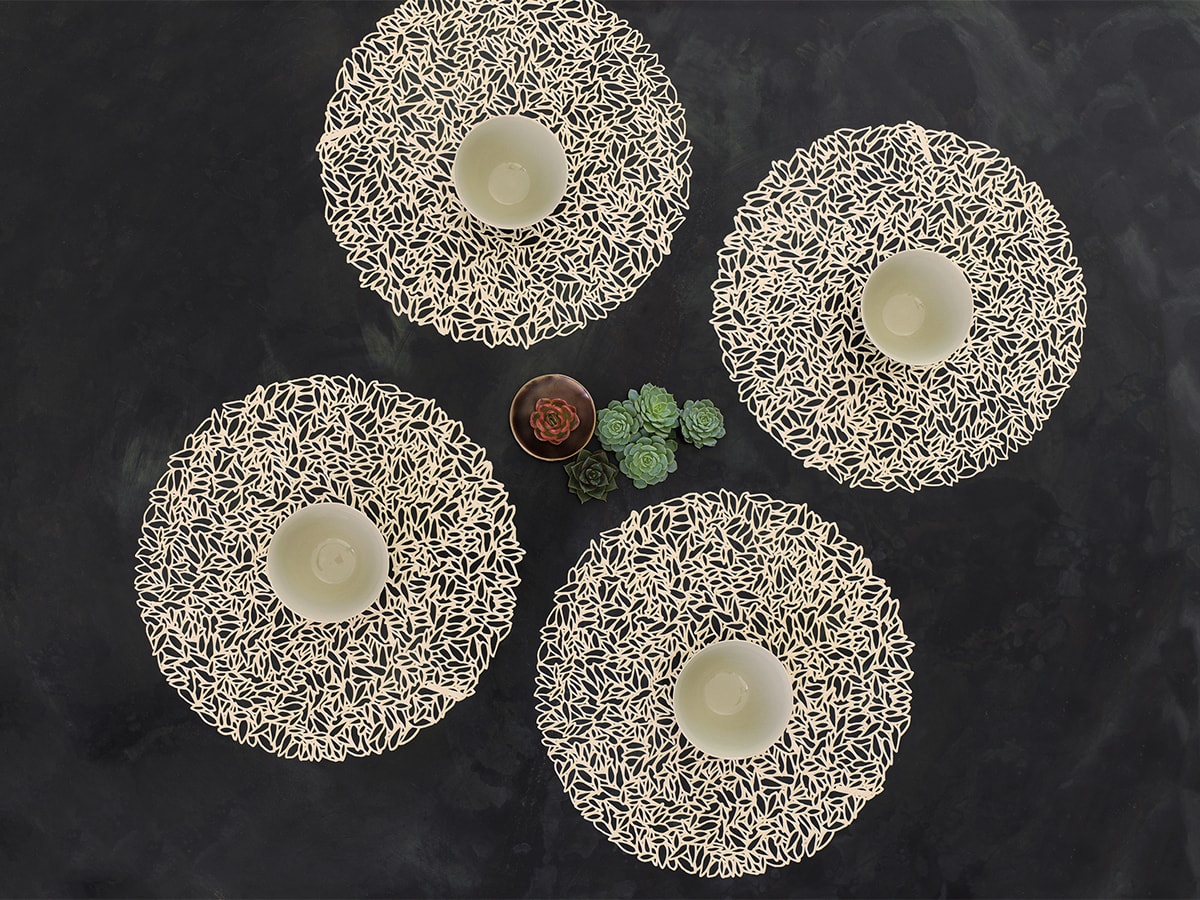 Dahlia extends Chilewich’s innovative molded technique beyond the first circle of experimentation. Acting more like a charger than a placemat, plates will sit surrounded and enhanced by the open lace cutwork it exhibits.