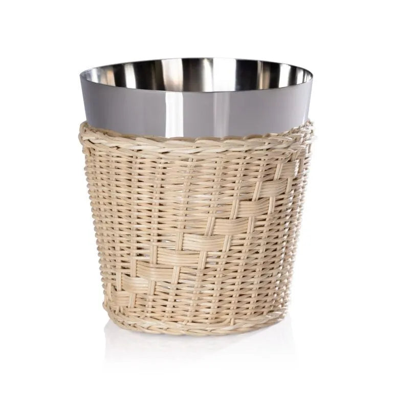 This elegant wine bucket combines the organic charm of handwoven natural rattan with the sleek sophistication of nickel-finished steel. The light-toned rattan wrap offers a warm, rustic contrast to the polished metal, creating a stylish centerpiece for any gathering. Each piece features subtle variations in color and texture, highlighting the unique character of the natural materials. Pairs perfectly with the Palmier Ice Tongs and Wine Cooler for a cohesive, sophisticated barware set.