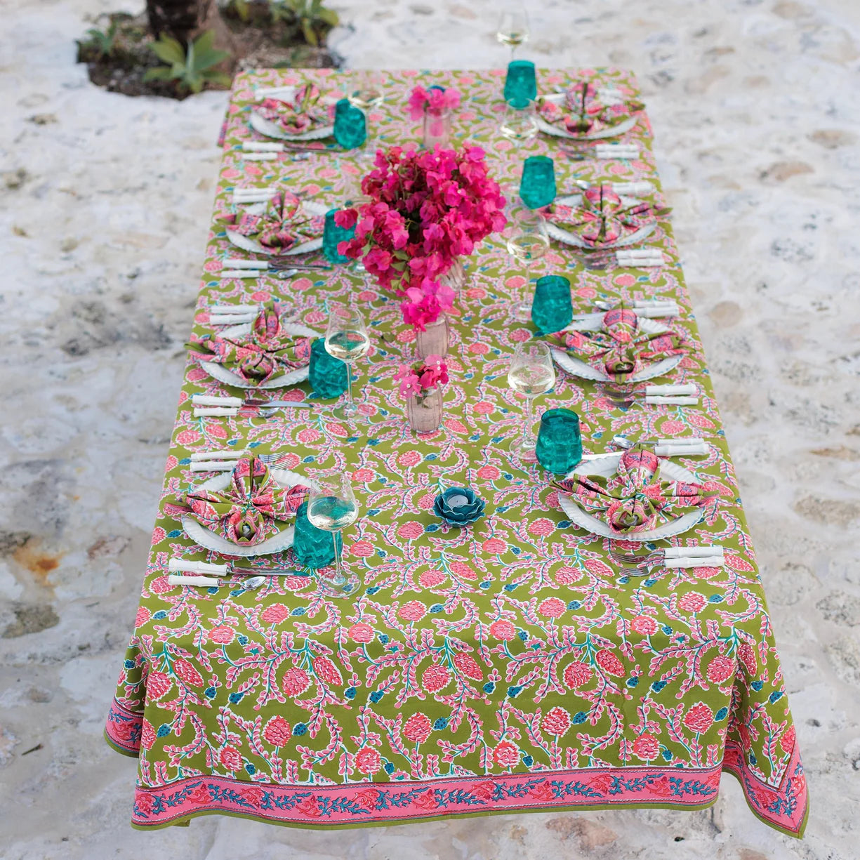 Channeling the iconic charm of Palm Beach, this vibrant tablecloth captures the essence of coastal dining with its bold botanical print in lush pinks and greens. Hand block printed on soft cotton, its intricate design reflects the effortless elegance of breezy verandas and sun-drenched gatherings. Whether for everyday dining or special occasions, it brings a touch of Palm Beach’s timeless style to your table.