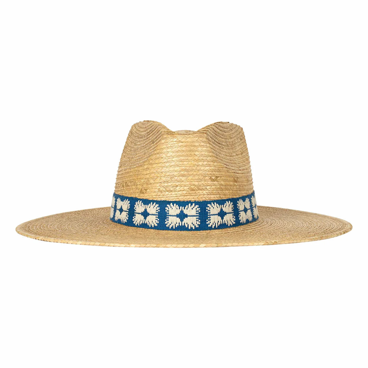 The Navy Flora Tile Palm Hat features a blue cotton band with white embroidered tiles and is a part of our sustainable, fair trade hat collection and graded at the highest UPF rating.