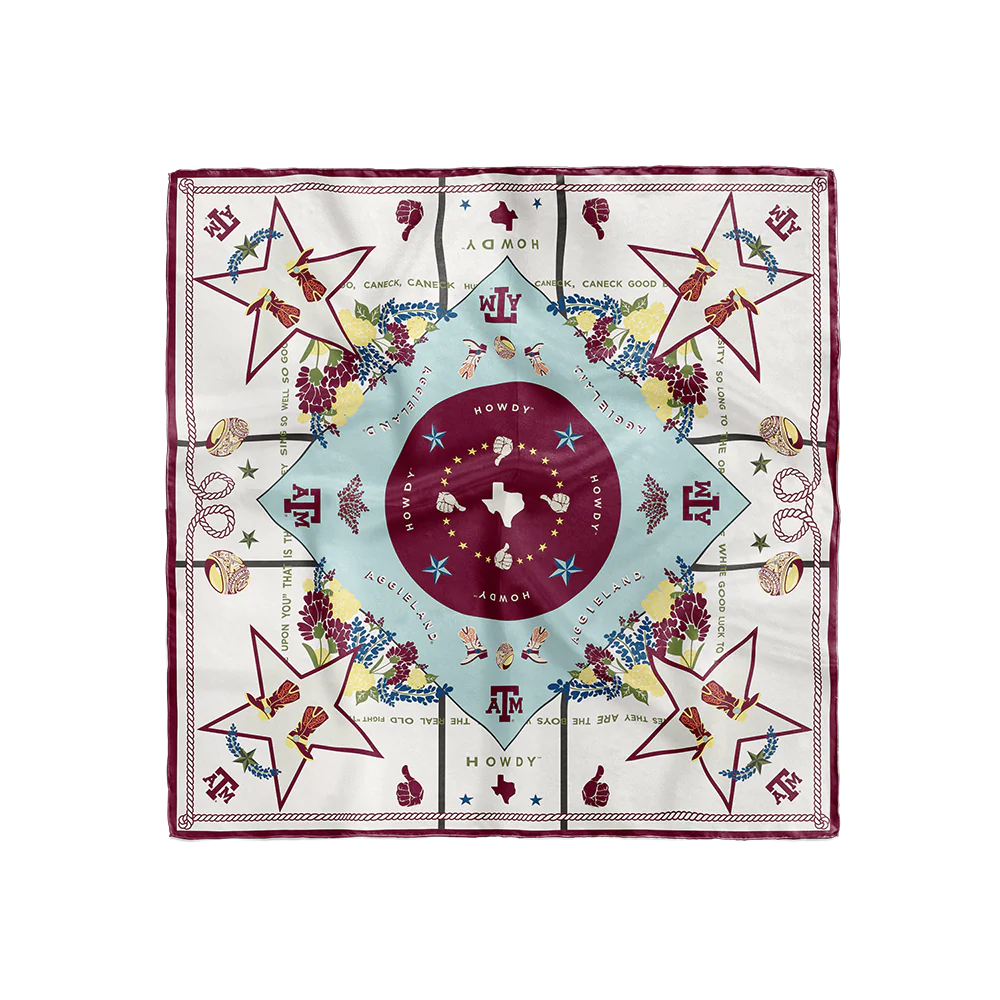 Celebrate Aggie spirit in timeless style with this officially licensed Texas A&M scarf. Crafted from 100% double-sided 16mm silk twill with hand-rolled edges, it’s luxuriously soft and versatile — perfect to wear as a wrap top, shawl, or classic neck scarf. Designed in Houston, Texas, this scarf showcases beloved Aggie traditions and symbols, beautifully packaged in a specialty Saturday Silks gift box.