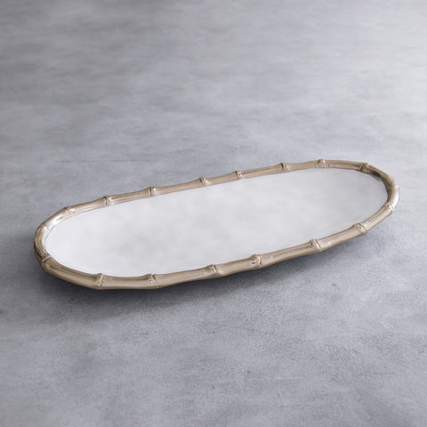 The THANNI Bamboo Medium Oval Platter (White and Gold) is an update on a classic design motif. Handmade of sandcast metal, the platter has great realistic details and a practical size. This bamboo-inspired oval platter in trending white and gold is a natural for stylish entertaining. Blends nicely with all the great Bamboo designs from Beatriz Ball. You will not believe that the finishes are so sturdy that they can go even in commercial dishwashers! An original Beatriz Ball design, sustainably handmade of a top quality, FDA safe, easy-care, oven and freezer friendly aluminum alloy.
