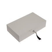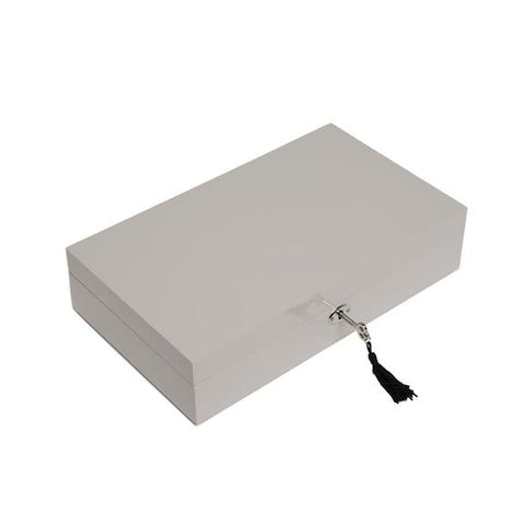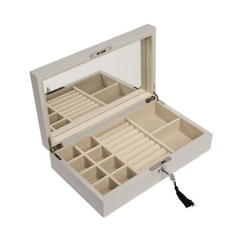 This gorgeous Jewelry Box is finished with a high-gloss lacquer, and its interior is lined with soft, ultra-suede. It also features a hinged lid with a vanity mirror inside, and a pretty little tasseled key so you can lock it. The Jewelry Box's interior features multiple plush compartments for rings, necklaces, earrings, brooches, and hairpins, and other small treasures. The High-Gloss Jewelry Box is a stylish way to stay organized.