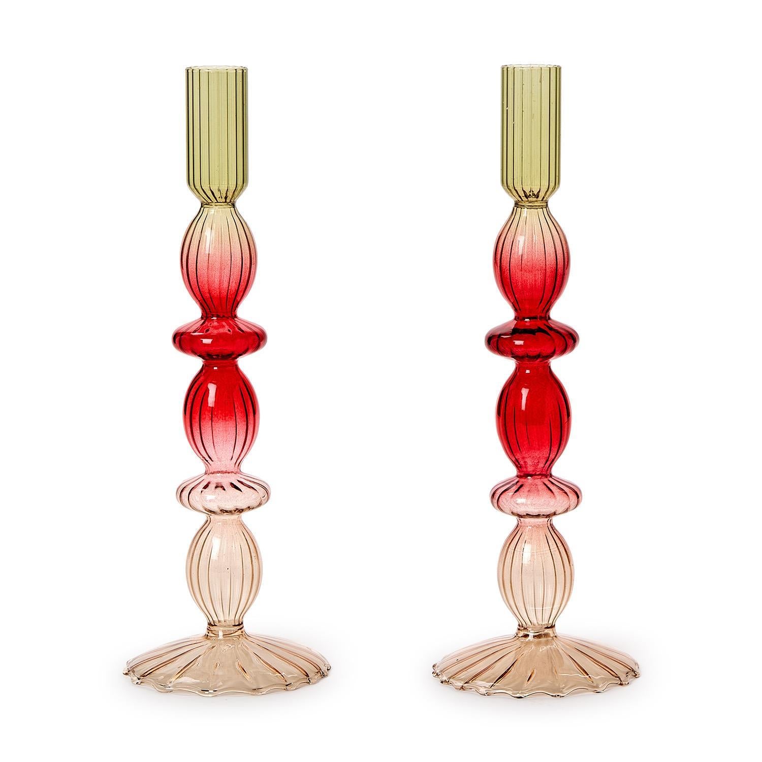 Enhance your holiday décor with this exquisite set of hand-blown glass candlesticks, featuring a stunning ombre effect. Designed in three unique shapes and festive color variations, these elegant pieces add warmth and sophistication to any table setting. Perfect for holiday gatherings, special occasions, or year-round décor, they bring a touch of artistry and charm to your space.