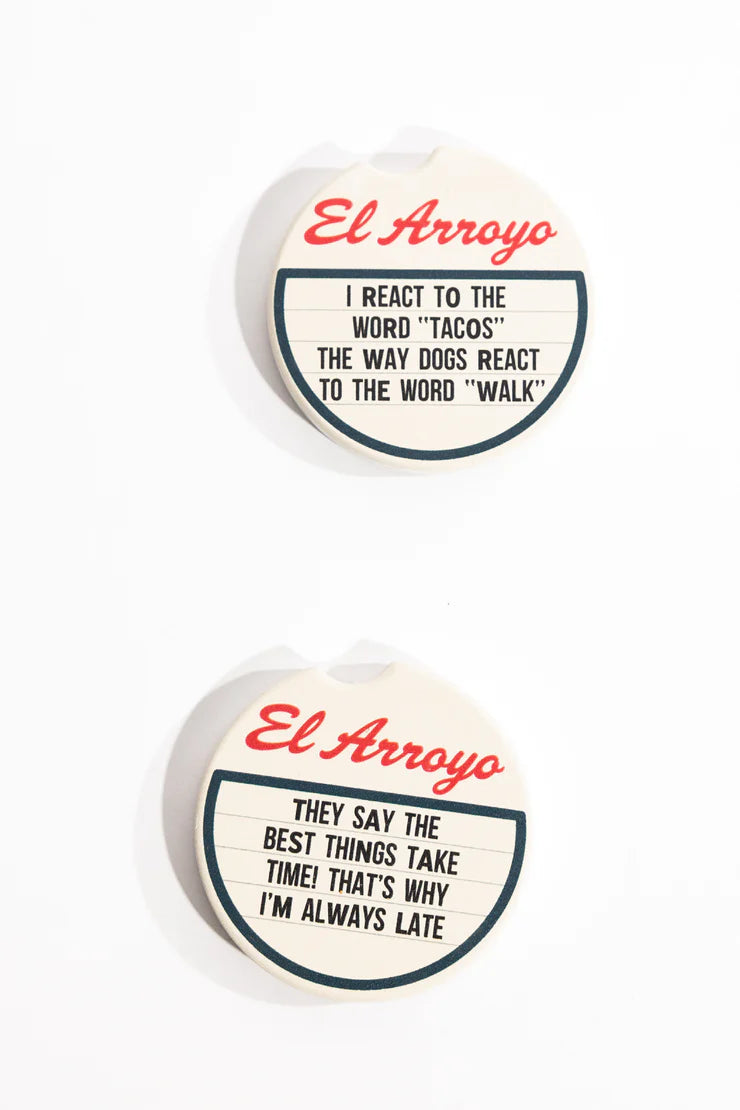 Never worry about spills in your car again with this hilarious Car Coaster Set! With two absorbent ceramic coasters, your drink holders will stay clean and dry even if you're always running late.