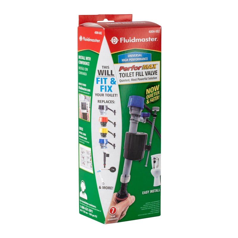 Fluidmaster 400H Toilet Fill Valve is one of the most quietest fill valve with the most powerful flush. The 400H comes with both tank and bowl water control for a more powerful flush. The adjustability of the bowl water helps this valve work in all older as well as newer toilets. If your toilet is slow filling, noisy or is running constantly, then replace your fill valve with the Fluidmaster PerforMAX 400H valve.