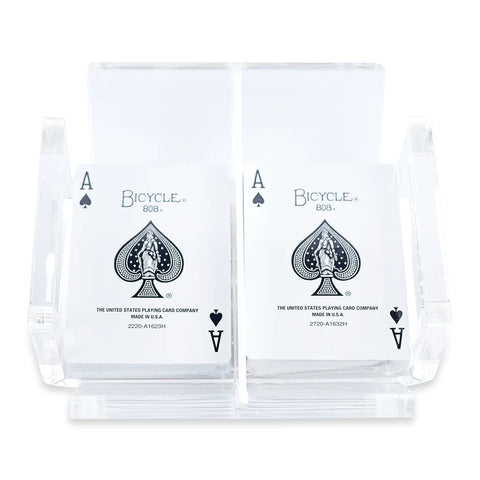 This open canasta tray has 2 sides to pull from, an opening for turn cards and a spinner. Great for play with 2 or 3 decks at a time. It comes with 2 decks of playing cards.
