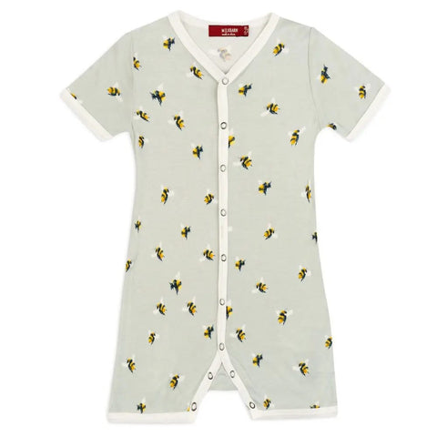 A fresh and modern interpretation on a classic silhouette, abuttery-soft bamboo Shortall in the Bumblebee print envelops our baby girls and boys in understated comfort.