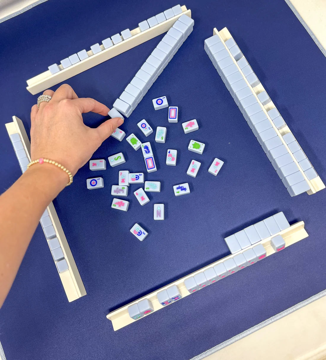 The set includes 160 Mahjong Tiles, 4 White Wooden Racks, Mahjong Mat, Tile Tote and Travel Bag that carries everything.