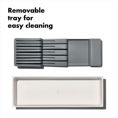 The OXO Good Grips Knife Drawer Organizer is the safe and tidy way to create a knife drawer with a custom look. Our Organizer holds five small knives and four large ones in a neat and compact tray to keep you safe when reaching into drawers and to protect your blades to help them last longer. The non-slip feet keep the Organizer in place when you open and close the drawer. The space-maximizing design features square corners to eliminate gaps and deliver a clean look in your drawers. The tray is removable for thorough cleaning.Features Safely and neatly store knives in drawers to save countertop space Designated slots for up to 5 small knives and 4 large knives Removable tray for easy, thorough cleaning Square corners eliminate gaps in drawers for a clean look Non-slip feet keep Organizer in place