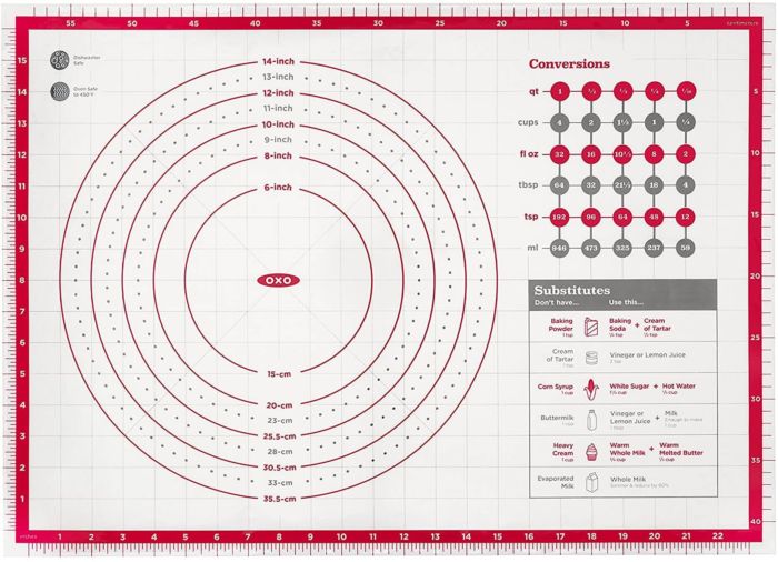 This Silicone Pastry Mat protects countertops while providing essential information for your baking adventures. The non-slip, food-safe silicone stays in place, and is non-stick for effortless food release. From dough diameter outlines to unit conversions, and even helpful tips for ingredient substitutes and a border that acts as a ruler, there’s no need to get any screens or books dirty looking up the information you need while baking. The Mat even has guidelines to help you roll dough to the perfect size for pies and pizzas.