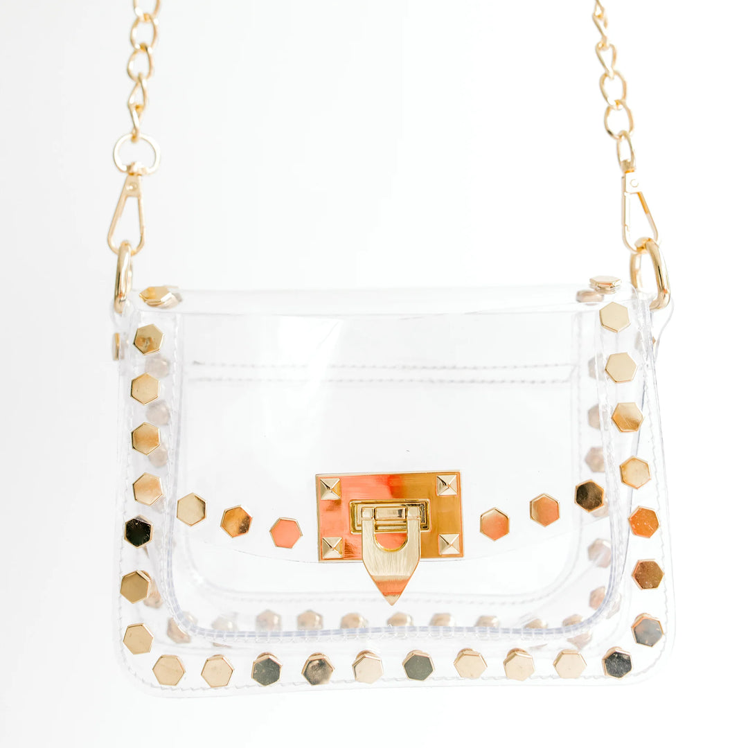 Score with the biggest winner in our clear handbag playbook - The Jackie! The Jackie changed the handbag game by proving clear handbags could be both functional and chic. This style includes gold hexagon metal studs and a gold chain. The Jackie is NCAA and NFL compliant and the ideal size to hold your wallet, phone, keys, lip gloss and a few other small items.
