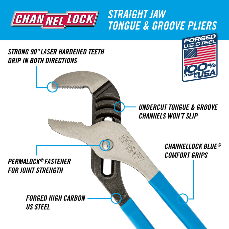 Channellock Straight Jaw Tongue and Groove Pliers are built to last with a PermaLock fastener to eliminate nut and bolt failure, patented reinforcing edge to minimize stress breakage and laser heat-treated teeth to provide a better, longer lasting grip. Pliers are Made in USA and forged from high carbon steel that is specially coated for ultimate rust prevention.